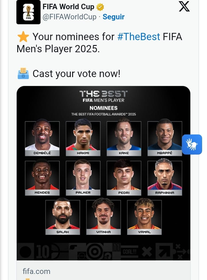 A Fifa informou que a relação de 11 finalistas do prêmio de melhor jogador masculino foi elaborada por um painel de especialistas. Agora, o grande vencedor será definido por meio de uma votação (que começou nesta quinta e irá até o dia 28 de novembro) que contará com indicações de técnicos e capitães das seleções masculinas das 211 federações-membro da FIFA, representantes da mídia (jornalistas especializados em futebol) e torcedores cadastrados no site