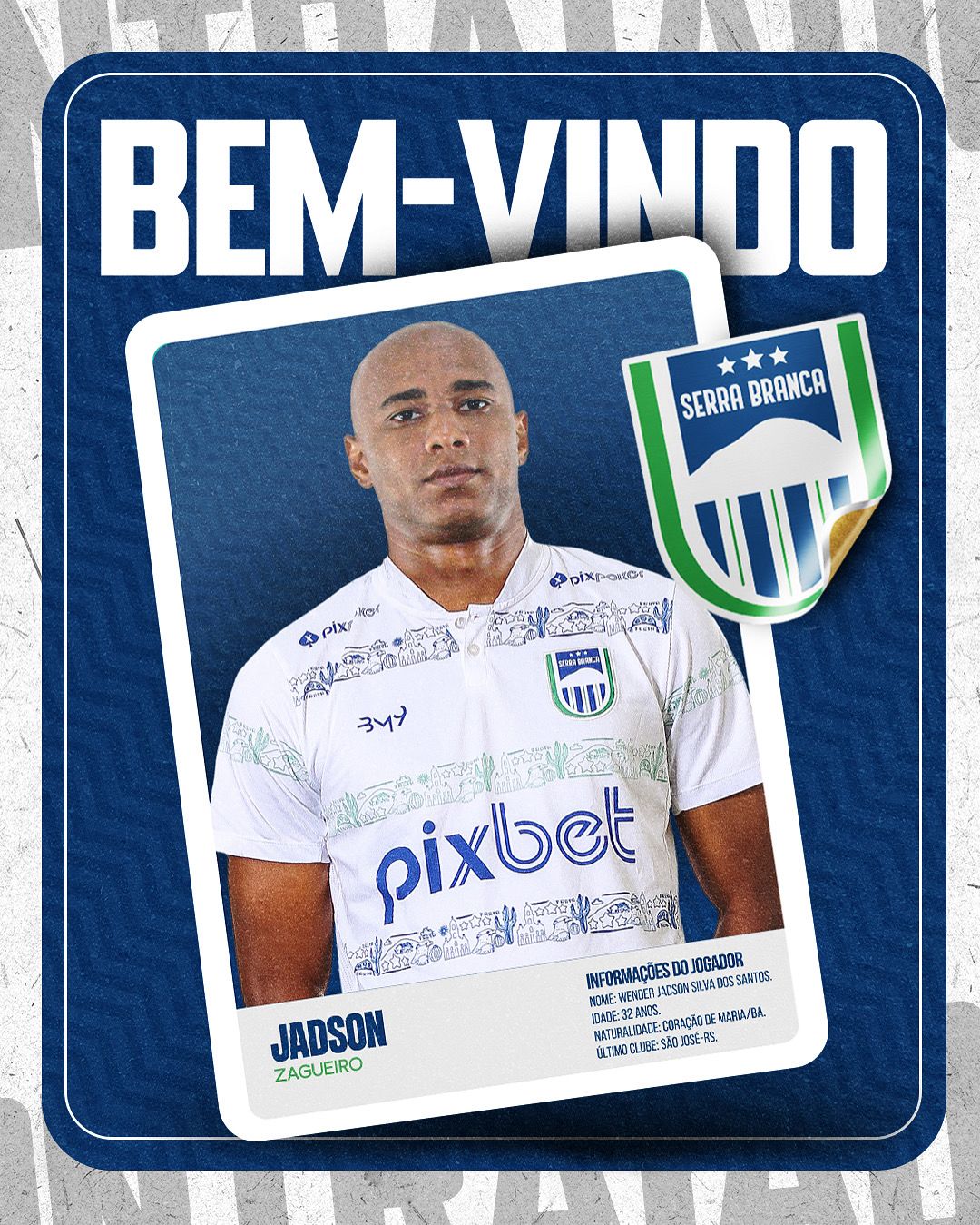 A 18ª contratação do Serra Branca para a temporada 2026 é o zagueiro Jadson, Campeão Paraibano pelo Botafogo-PB