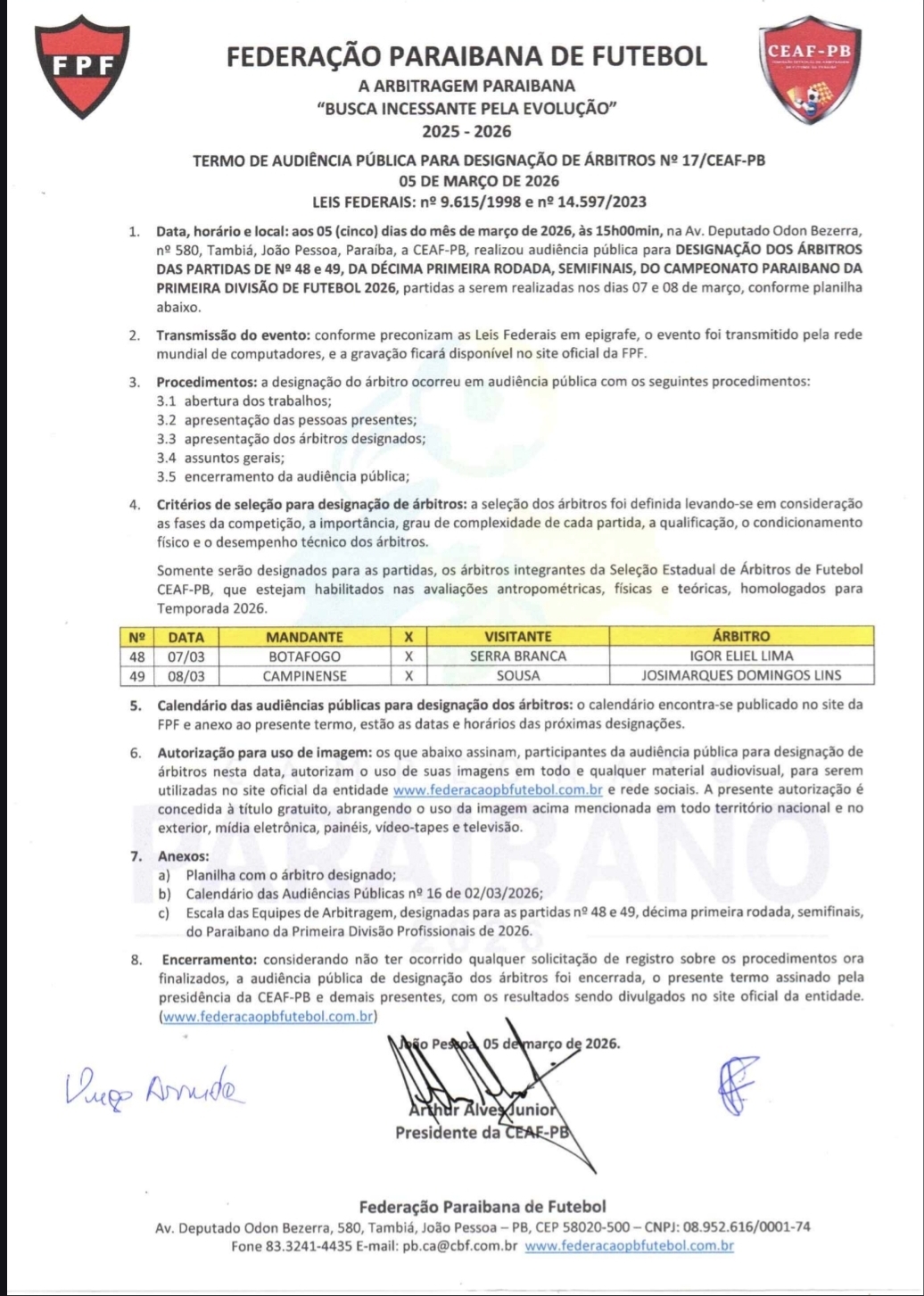 No confronto entre Botafogo-PB e Serra Branca, a arbitragem ficará responsável por conduzir um duelo considerado um dos mais equilibrados da fase decisiva. Quem apira será, Igor Eliel Lima arbitro central.