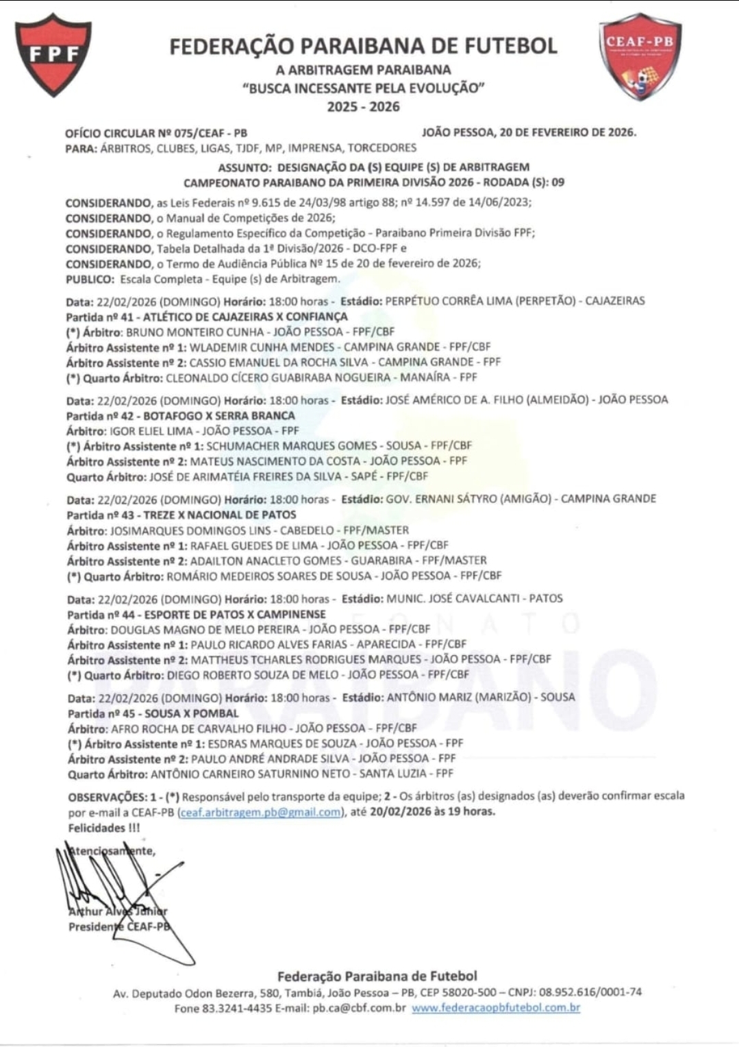 A Comissão de Arbitragem da Federação Paraibana de Futebol divulgou oficialmente a escala de árbitros para a última rodada. A definição acontece em meio a um cenário de expectativa elevada, já que a rodada final será decisiva tanto na parte de cima quanto na parte de baixo da tabela.