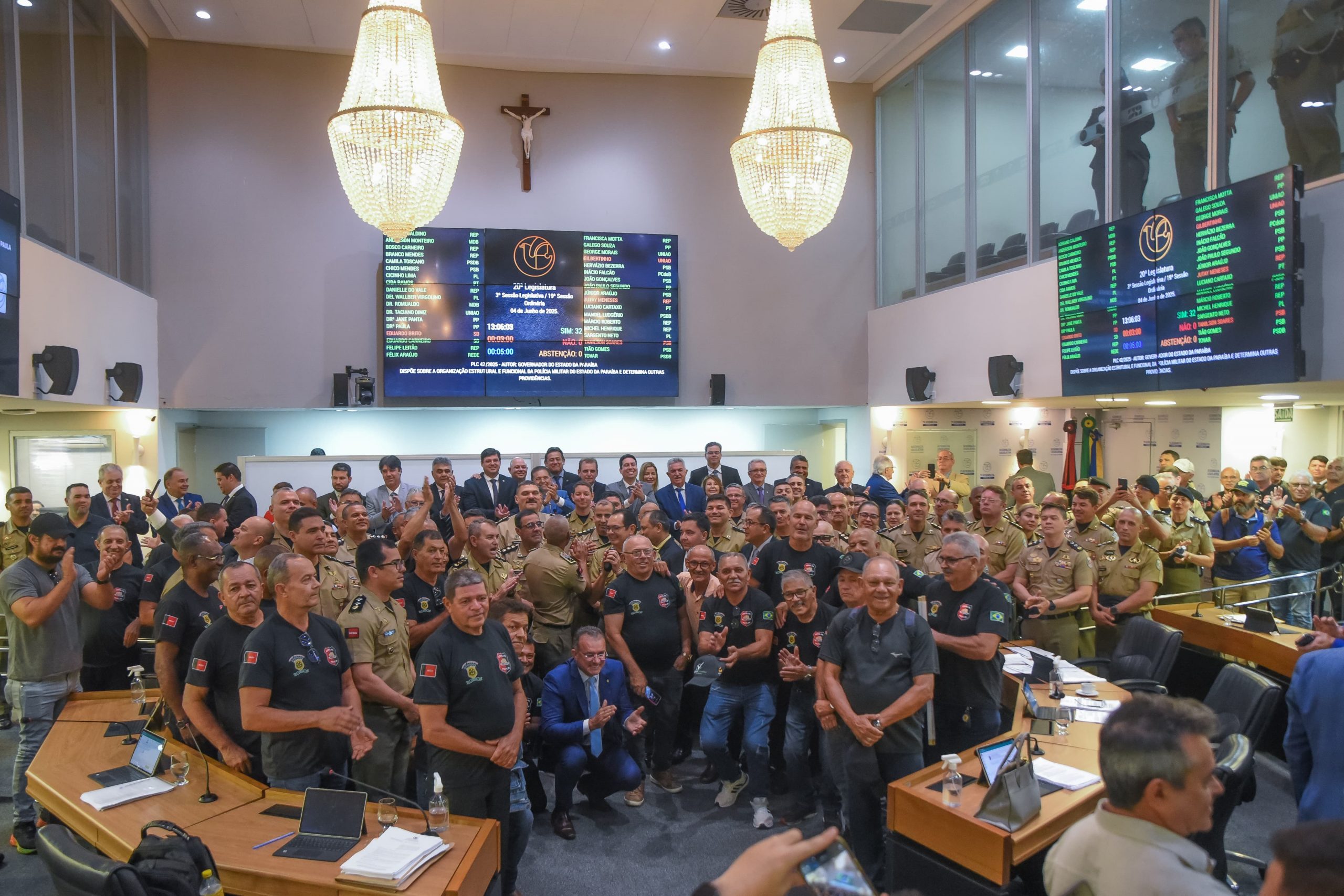 O PL 4.247/2025, que altera a Lei 3.908/1977, e que dispõe sobre os critérios e as condições que asseguram aos oficiais da ativa da PMPB o acesso na hierarquia policial-militar, mediante promoção, também foi aprovado por todos os deputados que participaram da sessão, marcada pela presença de membros da força de segurança do Estado ocupando as galerias da Casa de Epitácio Pessoa.