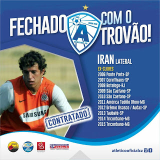 Trata-se do lateral Iran, com passagens por grandes clubes do futebol brasileiro como Corinthians em 2007, Botafogo-RJ em 2008, São Caetano, e seu último clube foi o Tricordiano de Minas Gerais. O ala já está junto de uma parte do elenco que treina em São Paulo, e irá desembarcar em Cajazeiras para a apresentação oficial, junto de todos atletas que vão compor o elenco Atléticano para a temporada 2017.