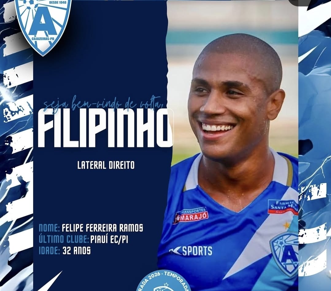 O Atlético de Cajazeiras anunciou oficialmente o retorno do lateral-direito Filipinho, de 32 anos, para reforçar o elenco do Trovão Azul na temporada 2026. O jogador volta ao clube após ter defendido as cores do time sertanejo nas temporadas 2019 e 2020, períodos em que conquistou o carinho da torcida e se sagrou Bi-Campeão Paraibano.