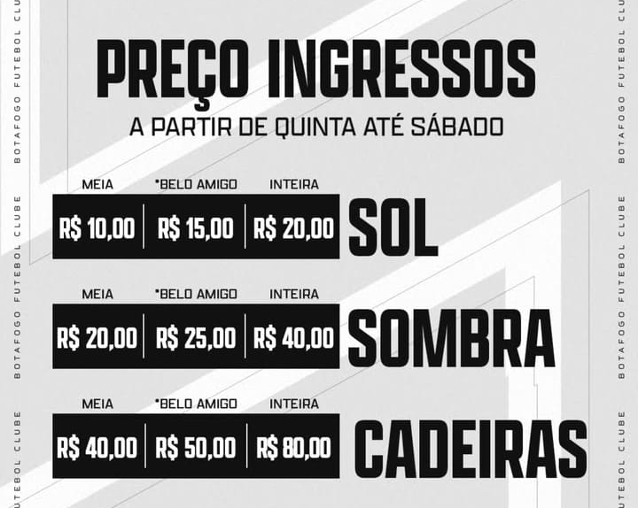 O Botafogo-PB divulgou nesta quinta-feira, os preços dos ingressos para o jogo contra a Picuiense pela 8ª rodada do Campeonato Paraibano no próximo sábado, às 16:30h no Estádio O Almeidão.