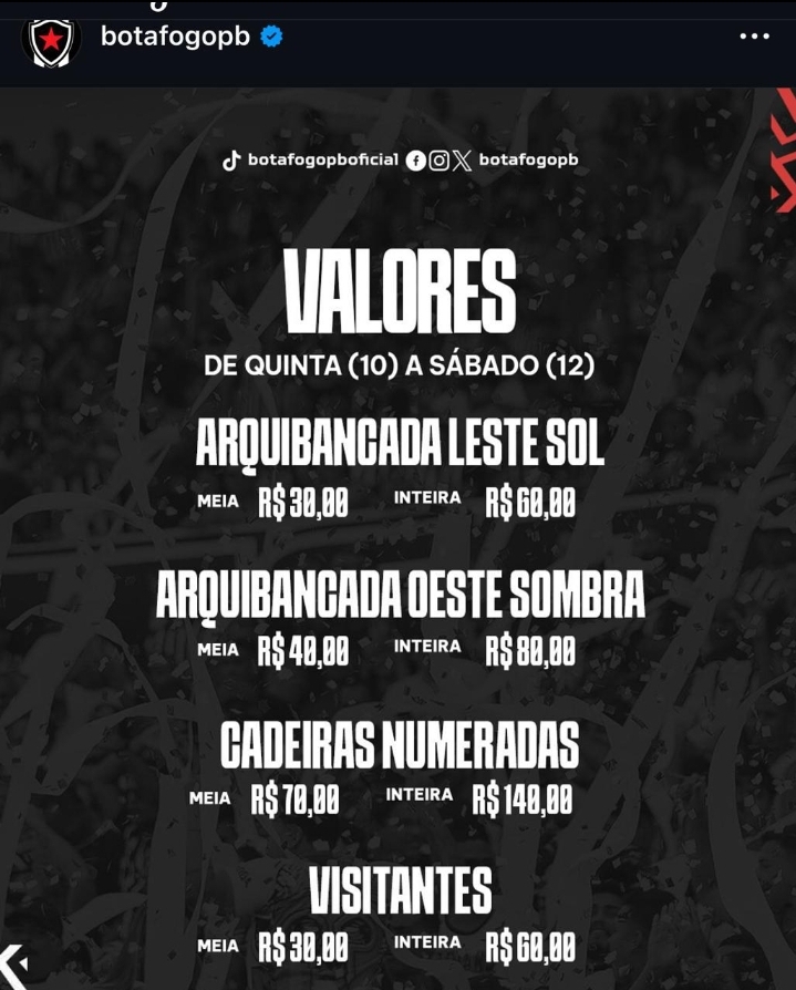 O Botafogo-PB começou nesta quinta-feira (10) a venda dos ingressos para a sua estreia no Campeonato Brasileiro da Série C. O Belo enfrentará o Confiança-SE no próximo sábado (13), às 16h, no estádio Almeidão, em João Pessoa, em partida válida pela primeira fase da competição.