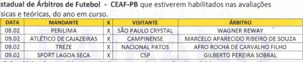 A comissão de arbitragem da Federação Paraibana de Futebol, divulgou os trios de arbitragem para os quatro jogos da 4ª rodada do Campeonato Paraibano de Futebol.