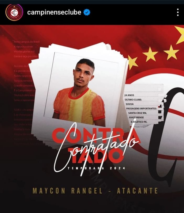 O Campinense anunciou as primeiras contratações para temporada 2024. Quando o clube tem pela frente o Campeonato Paraibano. Trata-se do goleiro Pablo Rodrigues, zagueiro Ramon Baiano e os atacantes Maycon Rangel e Lucas Reis.