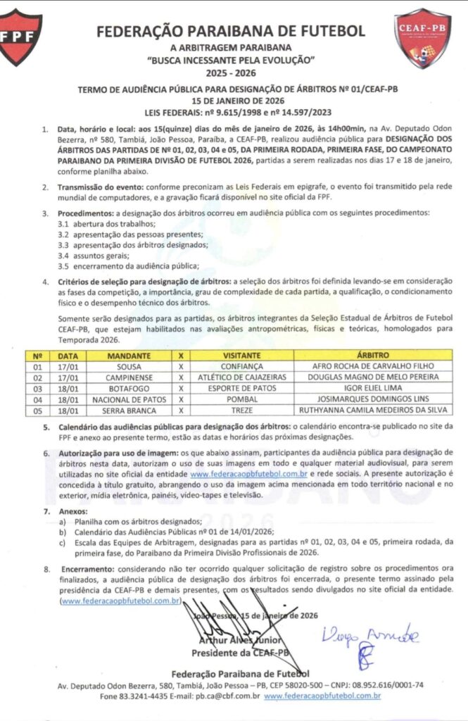O Campeonato Paraibano é uma das competições mais tradicionais do estado e reúne clubes de diferentes regiões, movimentando torcedores e fortalecendo o futebol local. A expectativa é de jogos disputados já na rodada de abertura, que contará com arbitragem preparada para atender às exigências da competição.