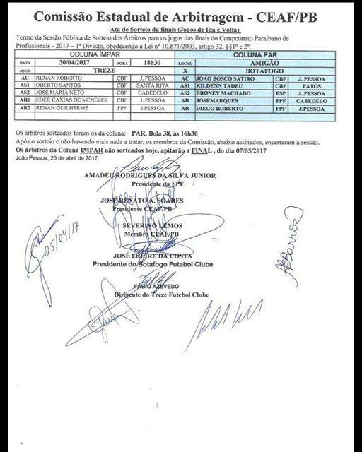 O sorteio foi feito na presença do presidente do Botafogo-PB(Zezinho) e Fábio Azevedo dirigente do Treze.