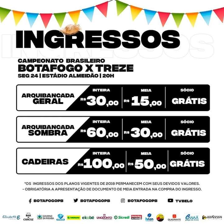 Confira os preços dos ingressos para Botafogo-PB e Treze pela Série C.