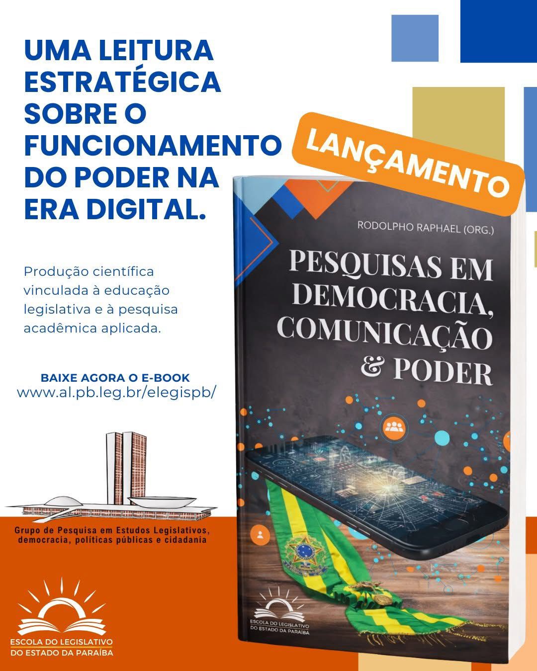 Escola do Legislativo da Paraíba (Elegis) lançou o e-book “Pesquisas em Democracia, Comunicação & Poder”, publicação que reúne estudos acadêmicos voltados à compreensão do funcionamento do poder, dos processos democráticos e da comunicação política no contexto da era digital.
