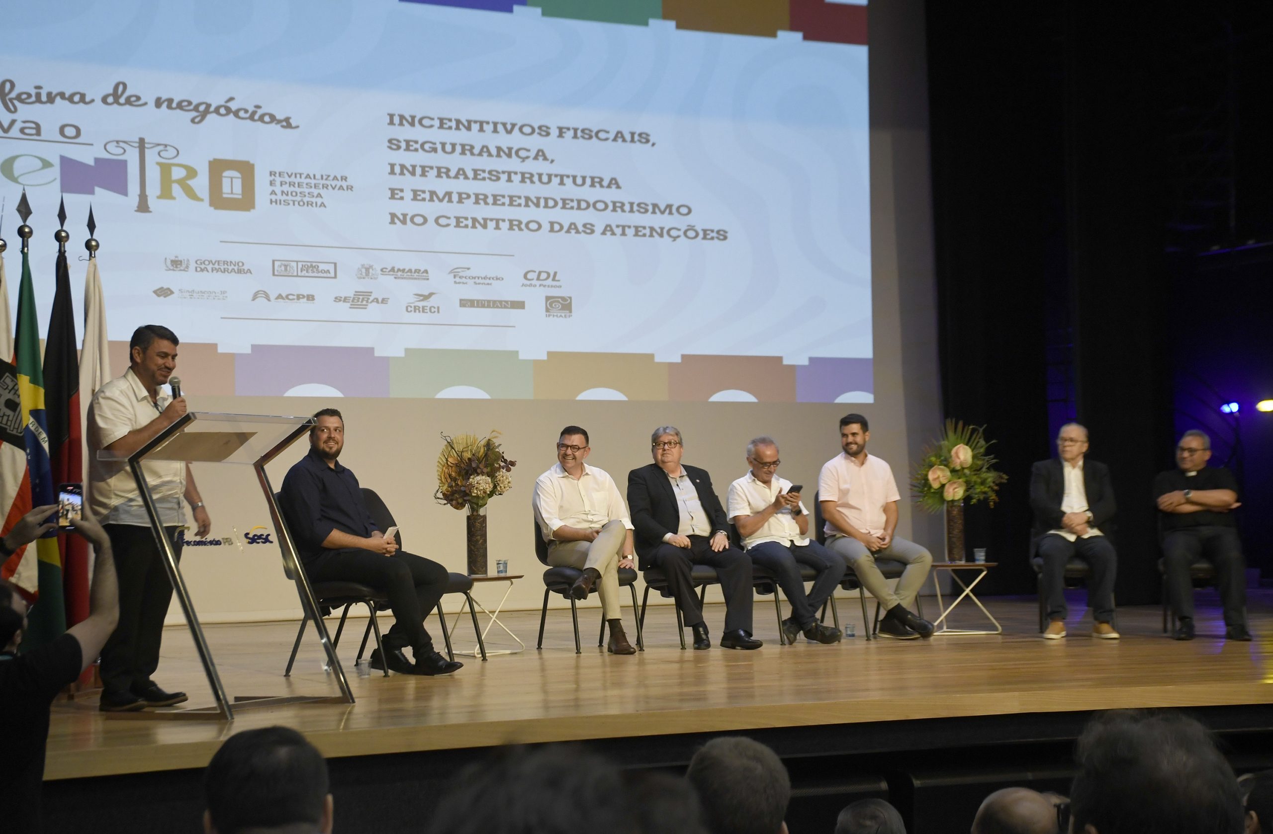 O Teatro do Sesc, no Centro, foi palco da abertura da Feira de Negócios Viva o Centro, na manhã desta quinta-feira (2). Durante a solenidade, o governador João Azevêdo, o prefeito Cícero Lucena e o presidente da Câmara Municipal de João Pessoa (CMJP), Dinho Dowsley (PSD), destacaram as ações que vêm sendo empreendidas pelos poderes públicos com o objetivo de impulsionar o comércio, revitalizar e ocupar a região central da Capital. O evento acontece nestas quinta (2) e sexta-feira (3), das 10h às 17h, no Teatro do Sesc, com estandes que apresentam os incentivos fiscais, programas de crédito e investimentos nas áreas de segurança, mobilidade, habitação e cultura.
