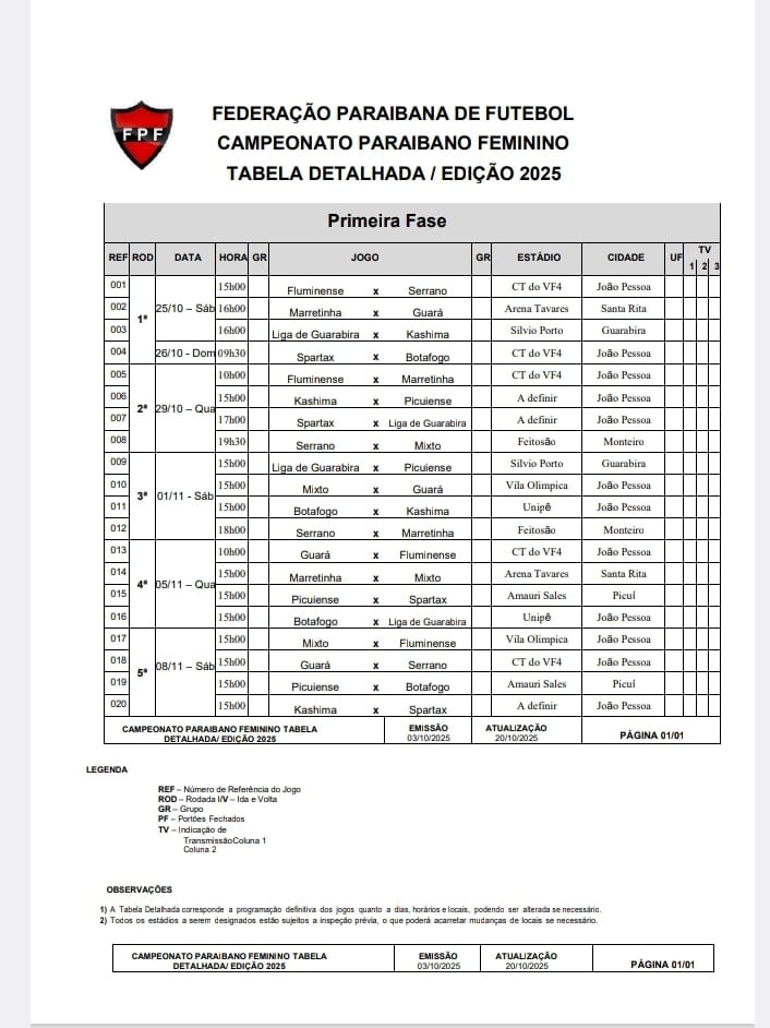 A Federação Paraibana de Futebol (FPF-PB) divulgou nesta terça-feira (21) a tabela detalhada do Campeonato Paraibano Feminino 2025. A competição terá início no dia 25 de outubro e se estenderá até o dia 8 de novembro.