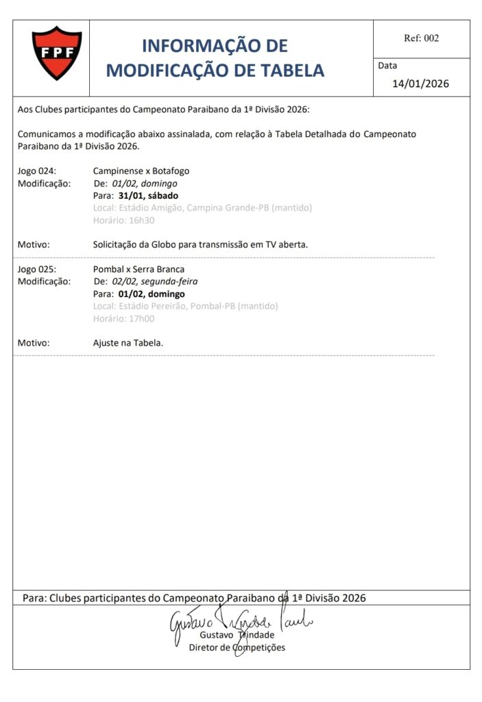A Federação Paraibana de Futebol (FPF) anunciou, nesta quarta-feira, mudanças na tabela do Campeonato Paraibano 2026 envolvendo partidas da quinta rodada da competição.