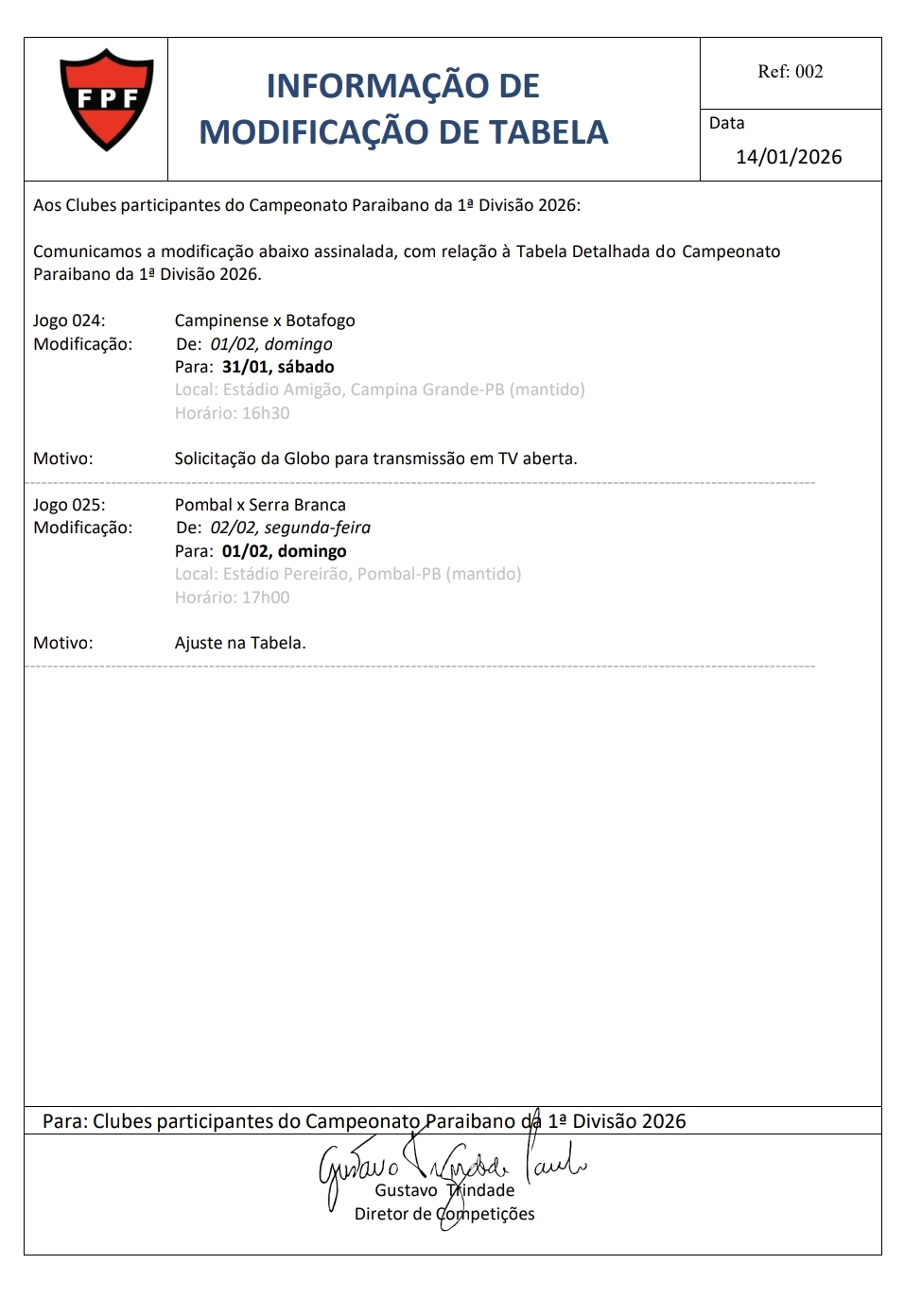Outra alteração confirmada pela entidade foi no duelo entre Pombal e Serra Branca. O jogo, que estava previsto para a segunda-feira, dia 2 de fevereiro, foi antecipado para o domingo, 1º de fevereiro.