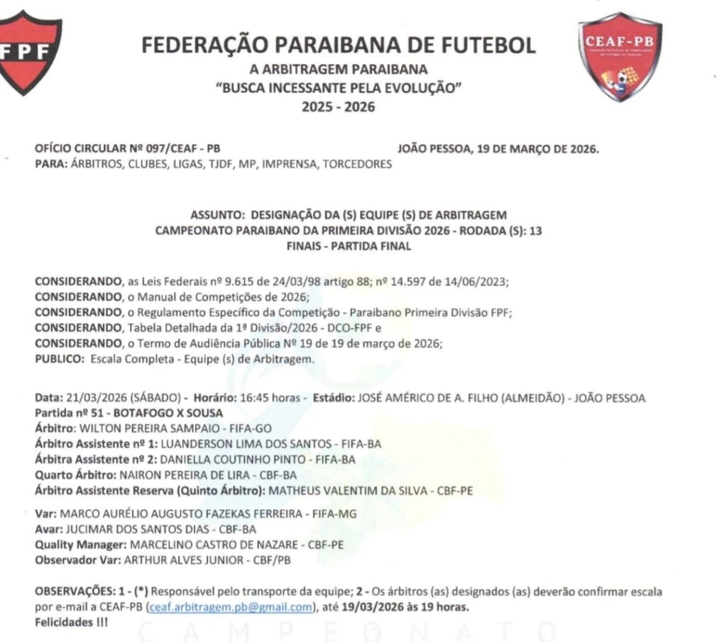 A Comissão de Arbitragem da Federação Paraibana de Futebol anunciou, nesta quinta-feira (19), a equipe responsável por conduzir a decisão do Campeonato Paraibano 2026. O confronto entre Botafogo-PB e Sousa acontece no próximo sábado (21), às 16h45, no Estádio Almeidão, em João Pessoa.