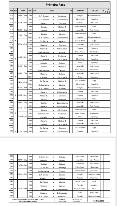 A Federação Paraibana de Futebol (FPF-PB) divulgou, na manhã desta terça-feira (12), a tabela detalhada da Segunda Divisão do Campeonato Paraibano 2025. A competição começa no dia 23 de agosto, um sábado, com dois jogos abrindo a disputa pelo acesso à elite do futebol estadual.