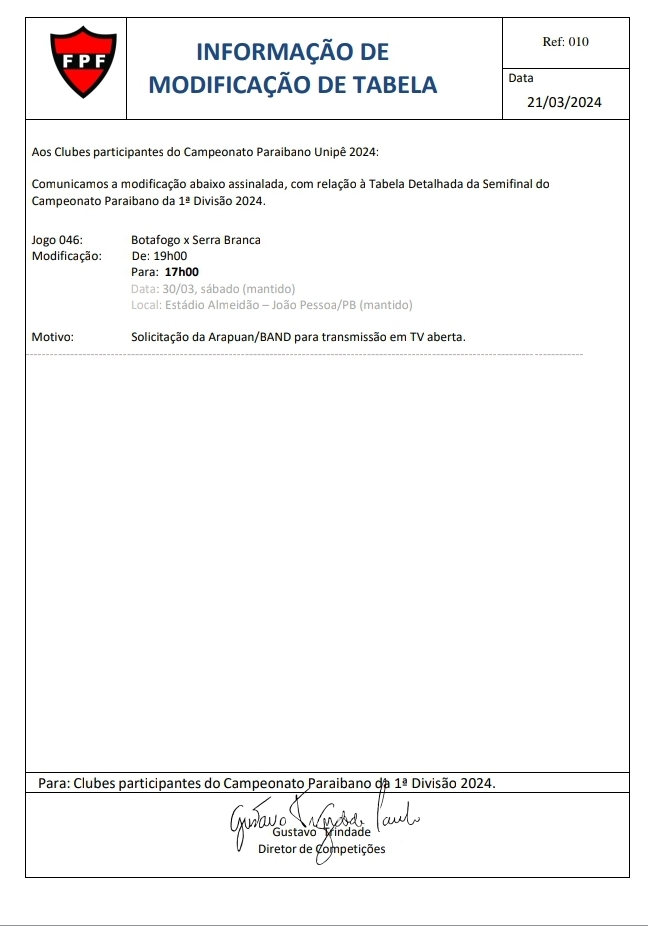 A Federação Paraibana de Futebol (FPF) alterou, nesta quinta-feira (21), o horário do primeiro jogo da semifinal do Campeonato Paraibano entre Botafogo e Serra Branca. A partida, que estava marcada para as 19h do dia 30 deste mês, agora será disputada às 17h, no Estádio Almeidão, em João Pessoa.
