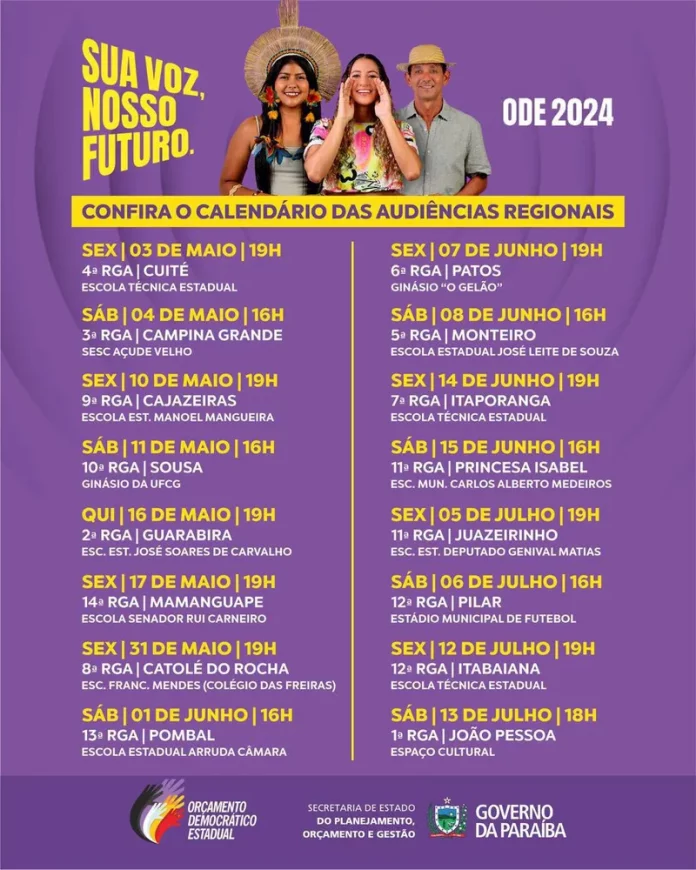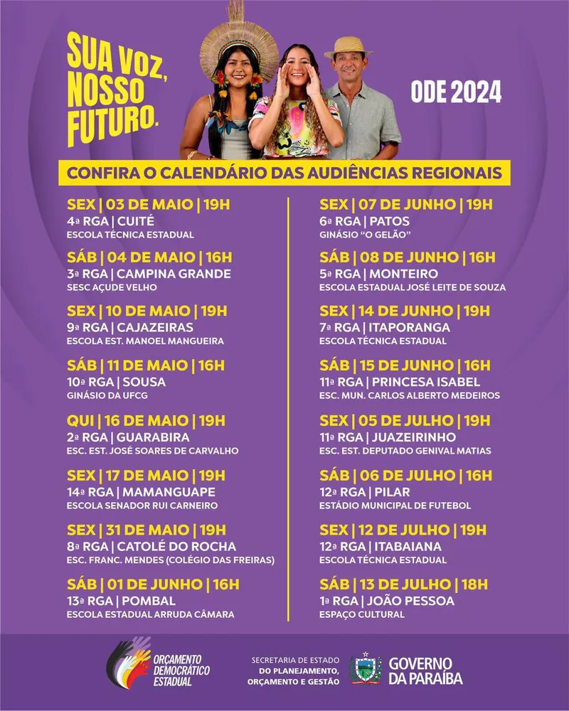 Plenárias do Orçamento Democrático – Além de Cuité e Campina Grande, as audiências do Orçamento Democrático vão acontecer em Cajazeiras (10 de maio), Sousa (11 de maio), Guarabira (16 de maio), Mamanguape (17 de maio), Catolé do Rocha (31 de maio), Pombal (1 de junho), Patos (7 de junho), Monteiro (8 de junho), Itaporanga (14 de junho), Princesa Isabel (15 de junho), Juazeirinho (5 de julho), Pilar (6 de julho), Itabaiana (12 de julho) e João Pessoa (13 de julho)