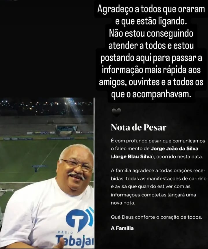 João Pessoa perdeu nesta terça-feira (14) uma de suas vozes mais marcantes do rádio esportivo. Morreu o radialista Jorge João da Silva, conhecido popularmente como Jorge Blau,i um dos nomes mais respeitados e reconhecidos da comunicação esportiva da capital paraibana.