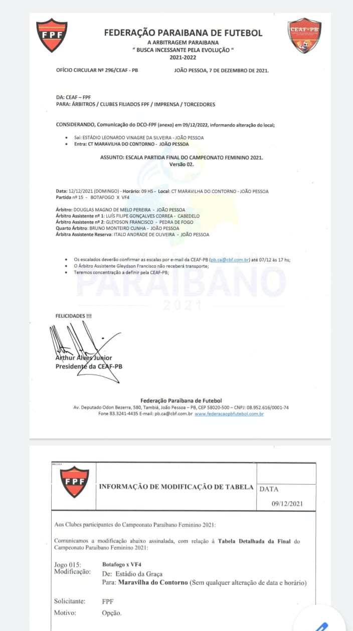 A Federação Paraibana de Futebol comunicou a alteração no local da final do Campeonato Paraibano de Futebol Feminino. O jogo estava marcado para acontecer no Estádio da Graça em Cruz das Armas. A Prefeitura Municipal de João Pessoa (PMJP) não recebeu o aval do Corpo de Bombeiros, que vetou a presença de público. Com isso, a final do Paraibano Feminino entre Botafogo-PB x VF4 vai acontecer no CT da Maravilha, ás 9:00 horas, Domingo(12).