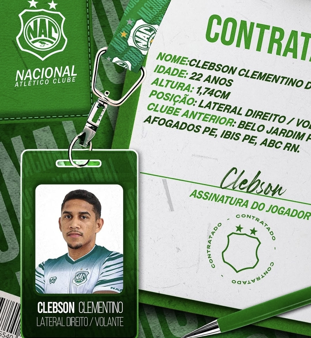 O Nacional anuncia a chegada de Clebson, lateral-direito / volante de 22 anos, 1,74m, com passagens por Belo Jardim, Afogados-PE, ĺbis e ABC-RN.