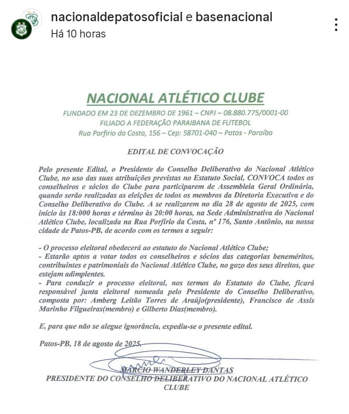 Pelo presente Edital, o Presidente do Conselho Deliberativo do Nacional Atlético Clube, no uso das atribuições previstas no Estatuto Social, CONVOCA todos os conselheiros e sócios do Clube para participarem de Assembleia Geral Extraordinária, quando serão realizadas as ELEIÇÕES DE TODOS OS MEMBROS DA DIRETORIA EXECUTIVA E DO CONSELHO DELIBERATIVO DO CLUBE, a se realizarem no dia 28 de agosto de 2025, com início às 18h00 e término às 20h00, na Sede Administrativa do Nacional Atlético Clube, localizado na Rua Portfólio da Costa, 176, Santo Antônio, Patos-PB, de acordo com os termos a seguir: