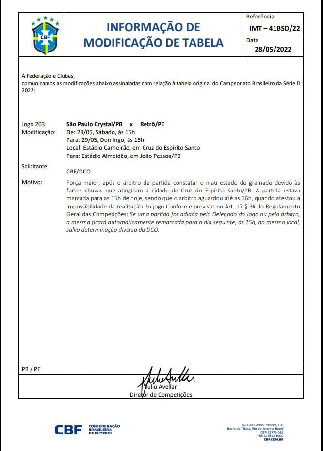 Por conta das fortes chuvas que têm caído em Cruz do Espírito Santo, o jogo pela sétima rodada do Brasileiro da Série D entre São Paulo Crystal e Retro- PE  foi adiado.