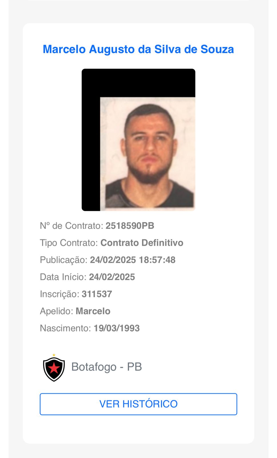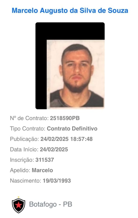 Saiu no Bid da Confederação Brasileira de Futebol,  o  contrato definitivo do zagueiro Marcelo Augusto de 31 anos, como novo reforço do Botafogo-PB para temporada 2025.
