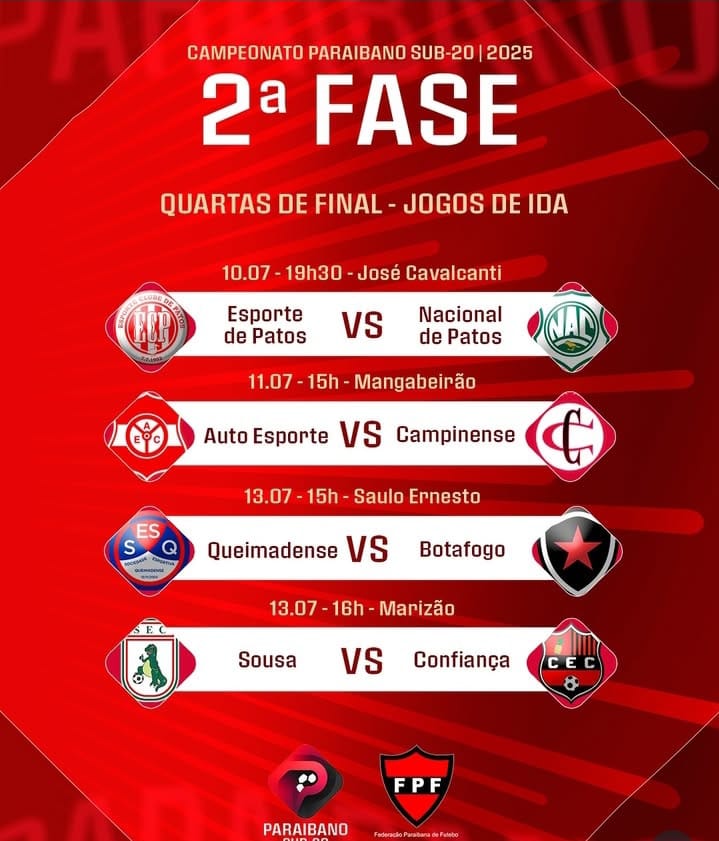 A bola vai voltar a rolar no Campeonato Paraibano Sub-20! A Federação Paraibana de Futebol (FPF) divulgou nesta terça-feira (8) a tabela oficial da segunda fase da competição, com datas, locais e horários dos confrontos que prometem agitar o futebol de base no estado.