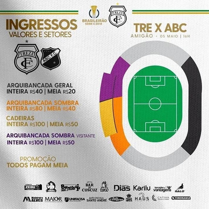 A diretoria do Treze divulgou os preços dos ingressos para partida contra o ABC-RN pela Série C do Brasileiro, no Estádio O Amigão em Campina Grande, no próximo domingo(05), às 16:00 horas.