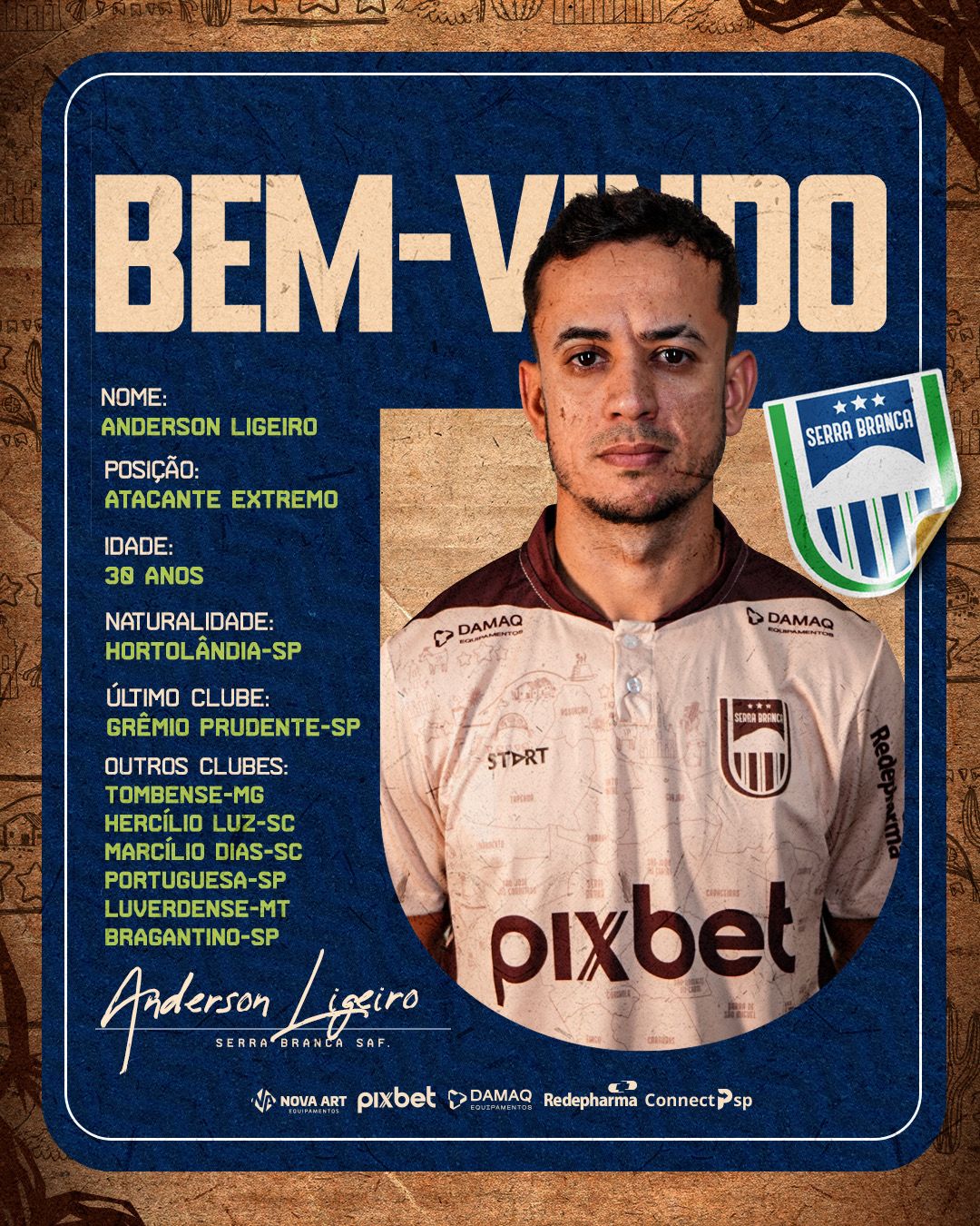 O novo contratado é o atacante de lado Anderson Ligeiro, de 30 anos, natural de Hortolândia, em São Paulo. Com muita velocidade e força pelos lados do campo, o atleta acumula passagens por clubes como Tombense(MG), Hercílio Luz(SC), Portuguesa(SP), Marcílio Dias(SC), Luverdense(MT), Bragantino(SP), entre outros, e chega ao Carcará após defender o Grêmio Prudente(SP).