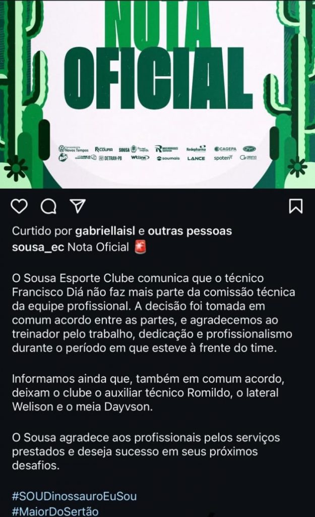 Em nota, a diretoria do Sousa agradeceu ao técnico Francisco Diá pelos serviços prestados e desejou sucesso na continuidade de sua carreira. O clube também destacou a confiança no trabalho de Tardelly Abrantes, que terá a missão de dar continuidade ao projeto da equipe nesta temporada.